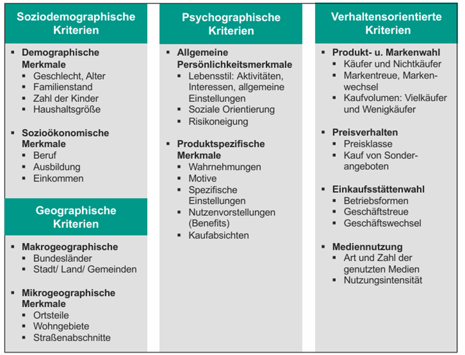 Geben Sie einen Überblick über die soziodemographischen, geographischen, psychographischen und verhaltensorientierten Kriterien.