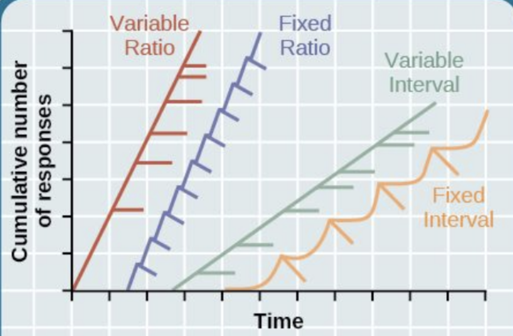 Graph showing no. of responses vs time for variable ratio, fixed ratio, variable interval, and fixed interval: