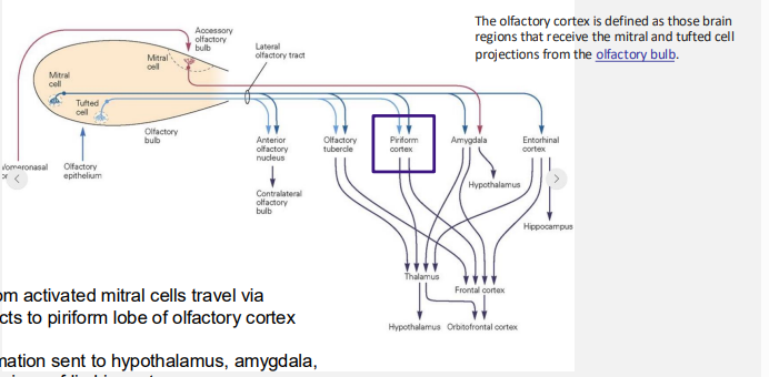 Impulses from activated mitral cells travel via olfactory tracts to piriform lobe of olfactory cortex