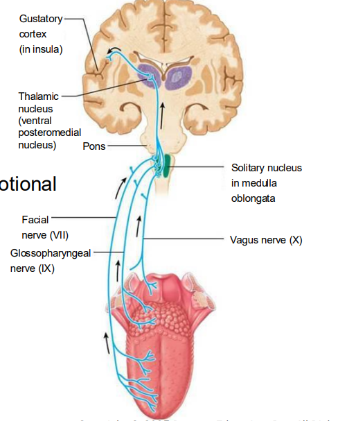 Fibers synapse in the solitary nucleus of the medulla, then travel to thalamus, and then to gustatory cortex in the insula