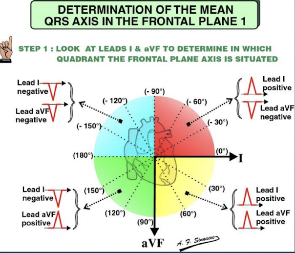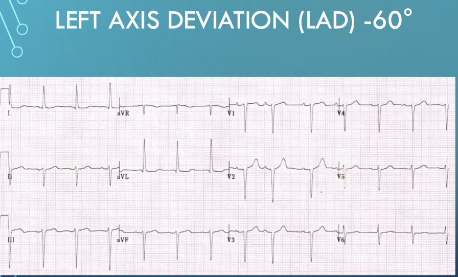 Lead I positive and Lead aVF negative indicates the axis is in the quadrant between 0˚ and -90˚; which suggests Left Axis Deviation (LAD).