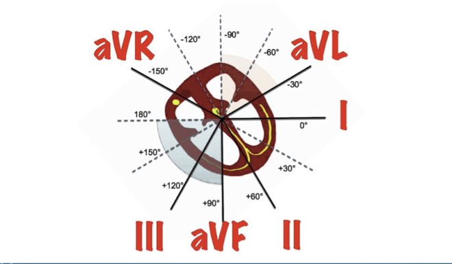 It is a combination of the three standard limb leads found in Einthoven’s triangle (I; II; III) and lines of derivation of the three unipolar limb leads (aVR; aVL; aVF).