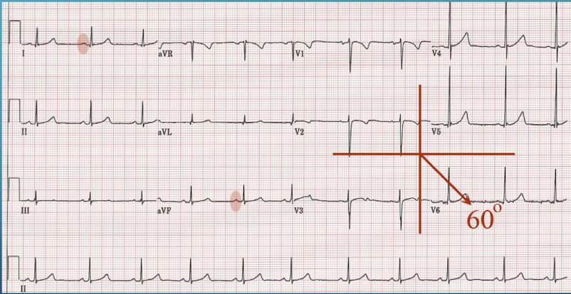 The axis is approximately +60˚; which is the positive pole of Lead II (90˚ away from aVL)