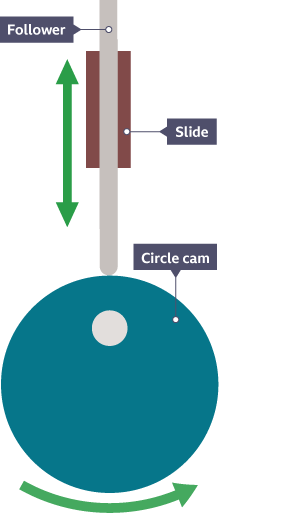 circular cams use an offf-centre pivot to cause the follower to move up & down. it will rise & fall by a reasonably large amount. can be seen in pistons eg on steam engines