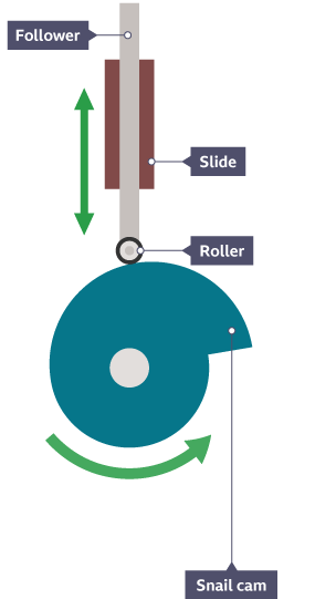 snail or drop cams look like a snail shell and cause the follower to stay stationary for half a turn before gently rising and suddenly falling. only work rotating in one direction. used on production lines to make regular holes / cuts in an item
