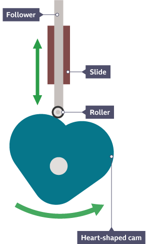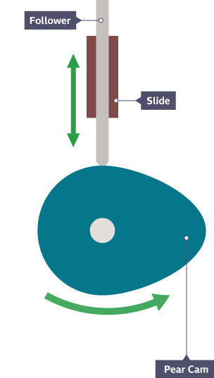 pear cams remain stationary for half a turn then gently rises & falls. used to make carousel horses rise & fall