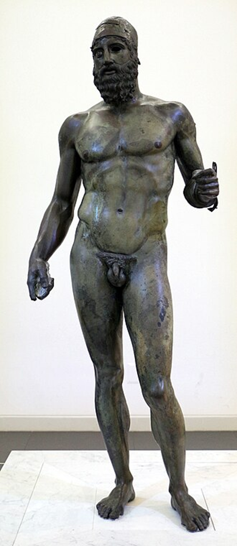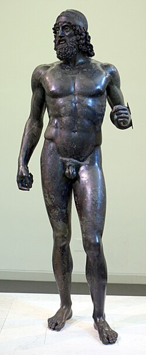 Riace Warriors. Found in Riace Marina in southern Italy in the sea. 460 with Roman repairs, from Argos, about 6 ft. This one is warrior B. Would have had shield and spear originally, shows contrapossto. Cast using lost-wax technique. Very elaborate. Severe style.