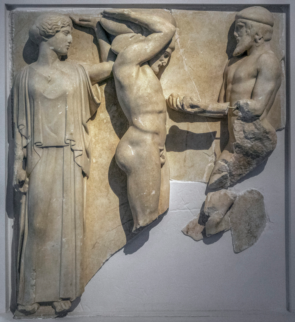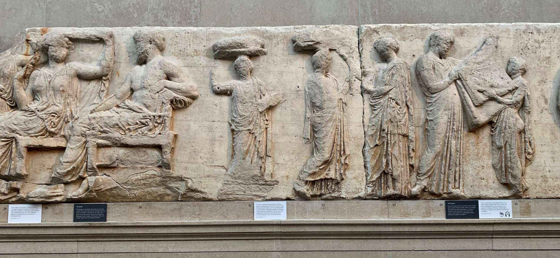Segment of the Parthenon frieze showing them preparing peplos (garment) for cult statue of Athena at the temple. Gods looking on and discussing. Basket bearers, first fruits and decorations for bull sacrifices. Shows an association with an actual procession the local public would have done and the gods who were watching them perform it; immortalizing local tradition through this new spiritual temple.