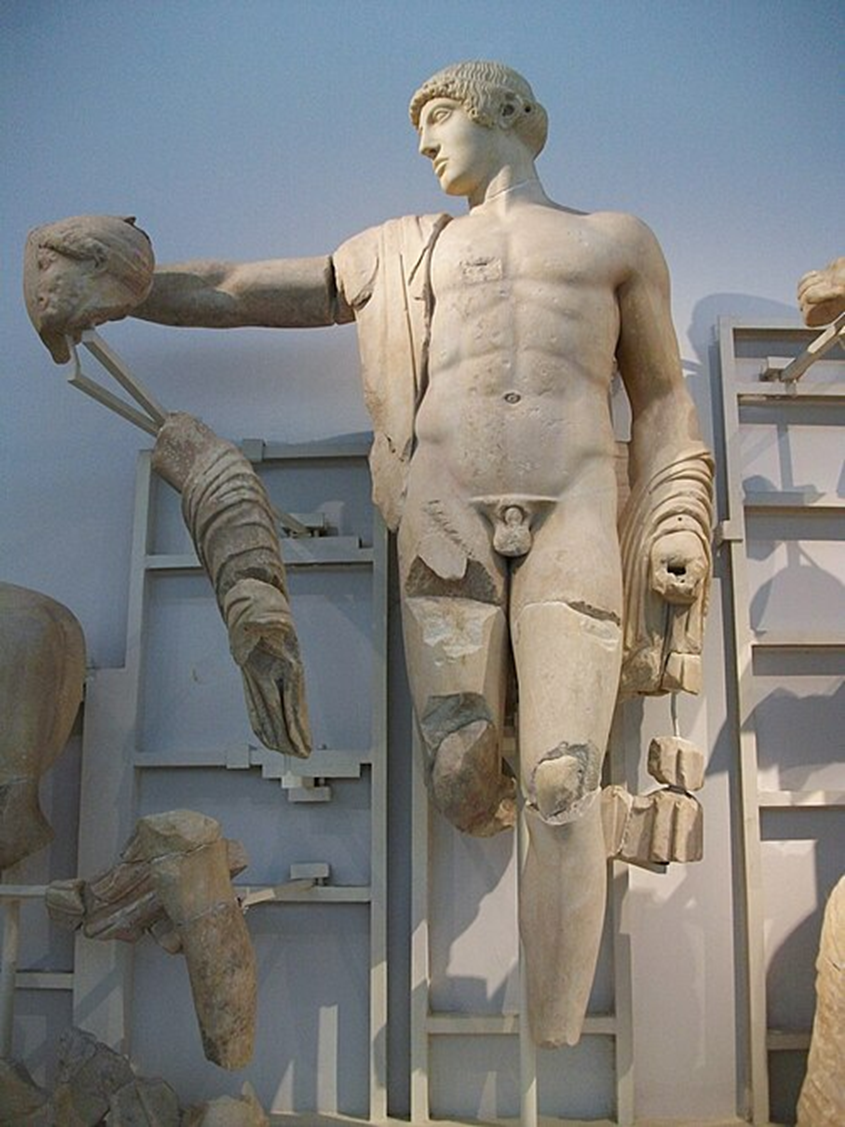Apollo, 10 ft tall, marble, west pediment from Temple of Zeus at Olympia, mid-5th century. From centauromachy scene which shows the battle between centaurs and Lapiths at a wedding. Disrupting guest-host relationship, Lapiths/Greeks win.