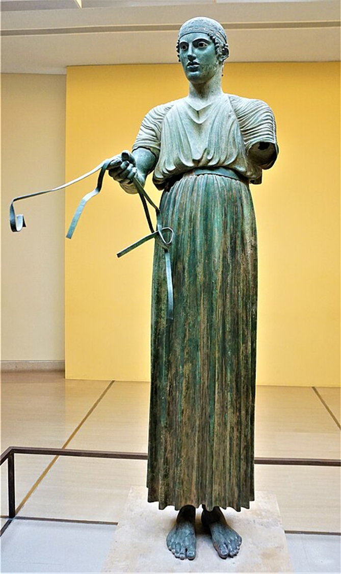 Delphi Charioteer. Hieron, tyrant of Syracuse in Sicily won chariot race at Delphi twice in 470s, made from 475-466, originally had 4-horse chariot with driver, 5ft 9 in tall. Shows transition from Archaic ideals to Classical. Resemblance with the athenian amphoras won by champions of olympic games.