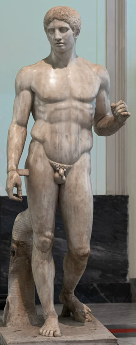 Doryphoros the Spear bearer, this is a roman marble copy of the Greek bronze by Polykleitos, very famous bronze sculptor. From Argos. 450-410. Poly wrote the “canon” about body proportions, his work had a lot of roman reproductions. Original made in 460, this found in Pompeii.