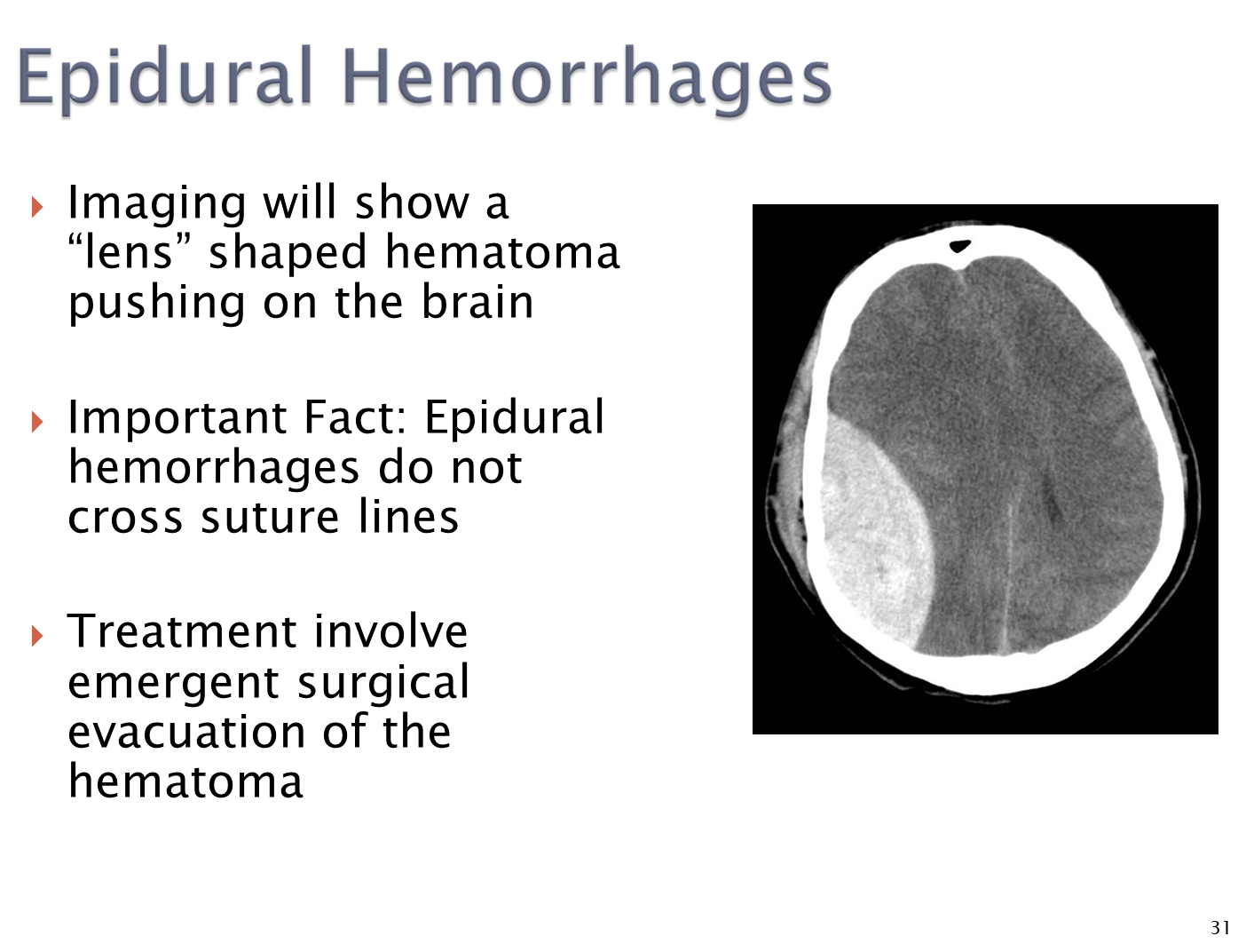 Epidural hemorrhage is a bleed into the epidural space between the skull and dura, this is commonly caused by trauma to the middle meningeal artery