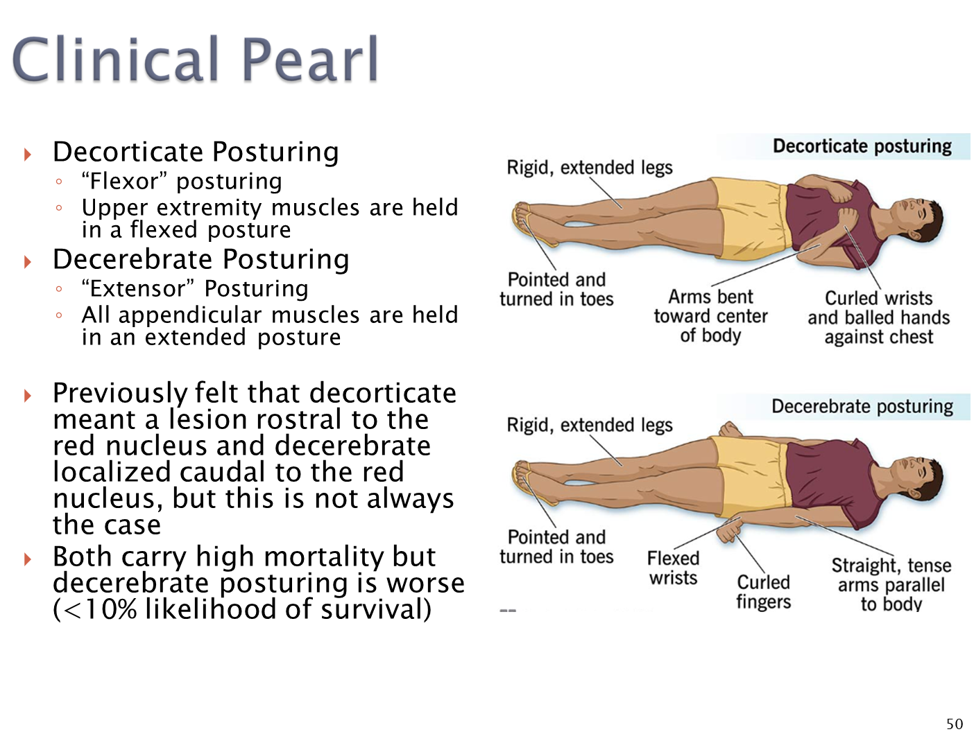 decorticate posture - caused by a brain injury of the red nucleus or higher