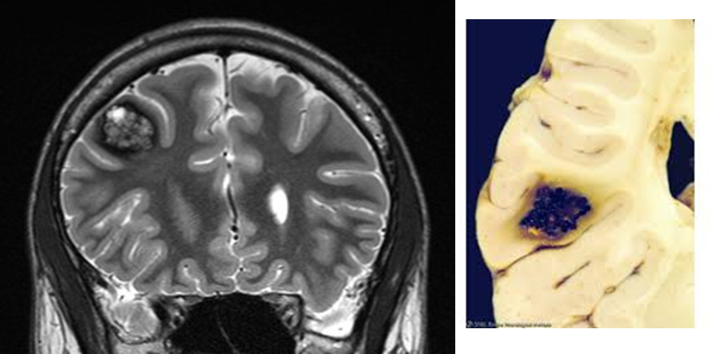 → gliotic, or glial cells, are often mixed in with the vascular tissue