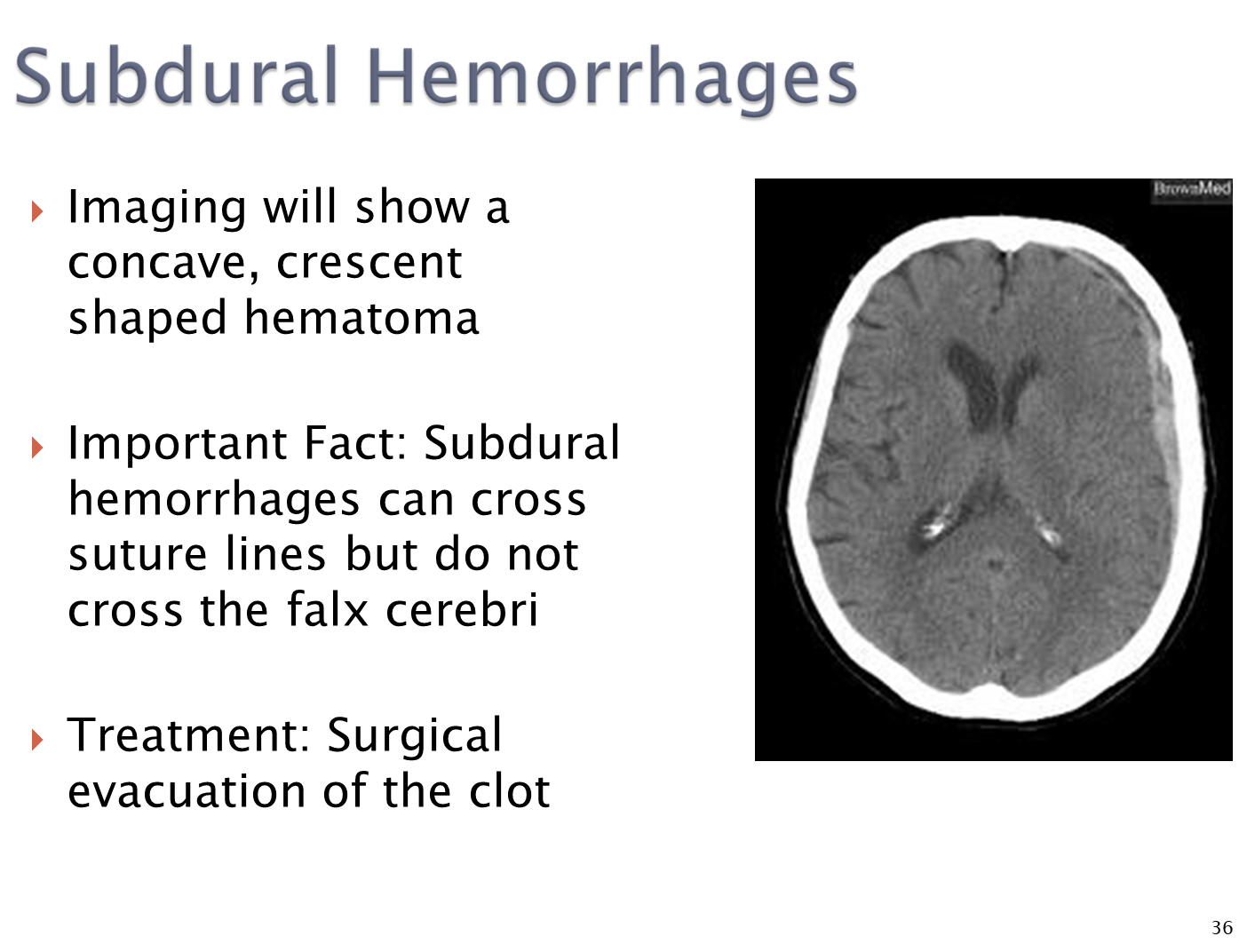 → subdural hemorrhages can cross suture lines but will not cross the falx cerebri