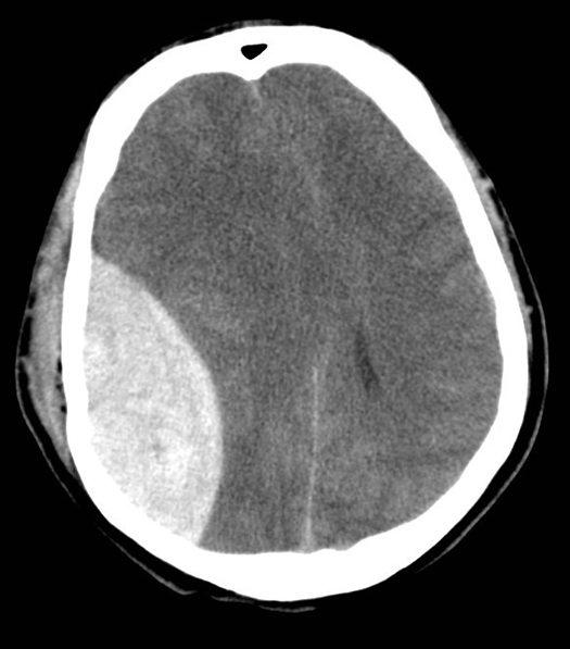 How does a subdural hemorrhage present on a CT scan and how is it treated?