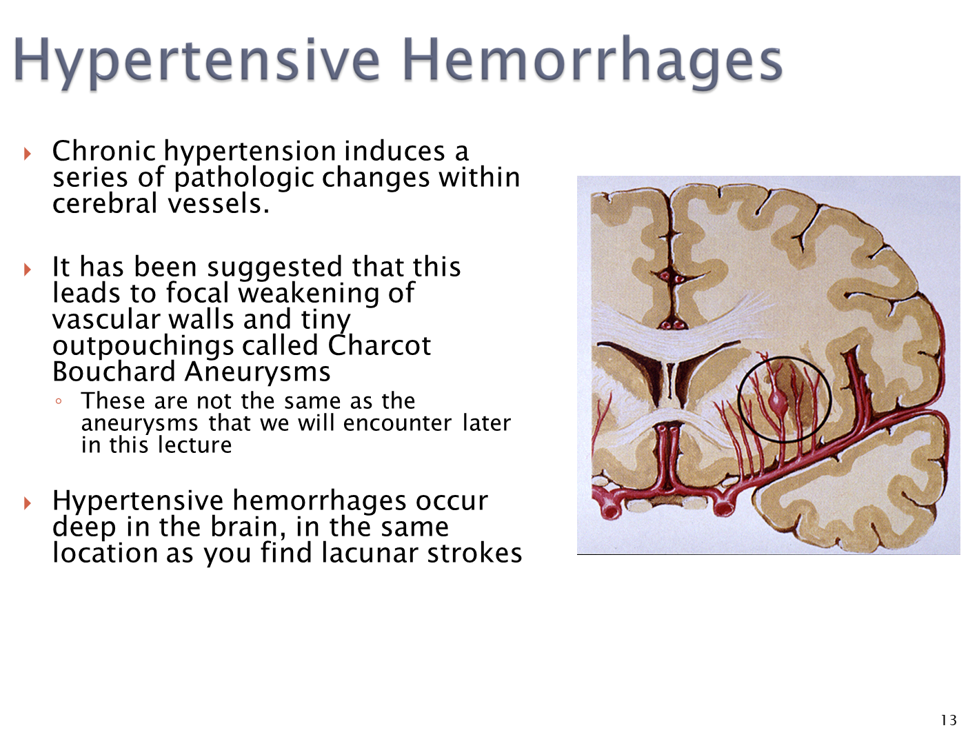 1) hypertension over long periods of time leads to focal weakening of vascular walls leading to outpouchings called Charcot Bouchard Aneurysms