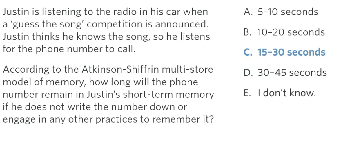 Short term memory has a duration of 18-30 seconds however, this duration can be increased by rehearsing information.