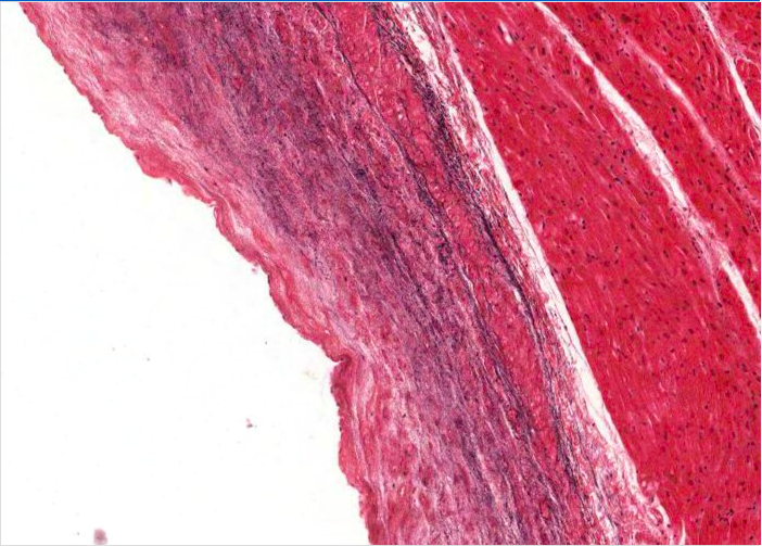 Examine the endocardium of the atrium. It is very well developed. It has an inner layer of endothelium and a deeper layer of connective tissue, elastica and smooth muscle. A further deeper layer is the "subendocardial layer" which becomes continuous with the connective tissue supporting the myocardium.