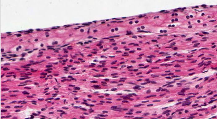 You would have already noticed that the tunica media is the thickest layer in the elastic artery (aorta). Although hard to see in H&E sections (imaged here), compared to aorta stained with the elastin stain you will observe in a later item, elastica appears as a blank pale wavy band, because it is made up of a hydrophobic protein and hence relatively impervious to aqueous dye molecules.