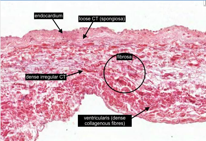Loose connective tissue (the "spongiosa") is on the atrial or blood vessel side of each valve. This layer acts as a "shock absorber" when the valve closes.