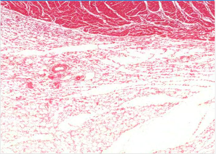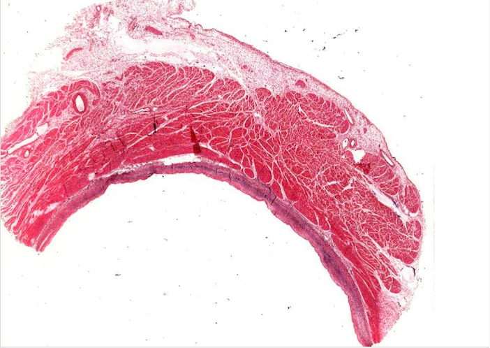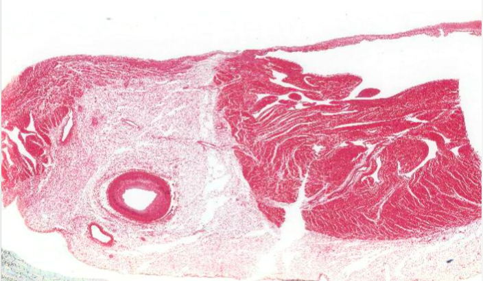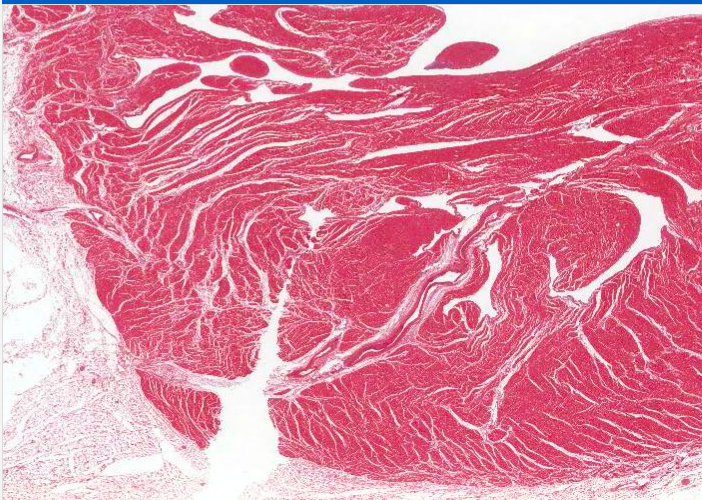 The main layer of the heart wall is the myocardium, which corresponds to the tunica media of an artery. It is a thick band of darkly stained cardiac muscle. Whilst the clear spaces throughout the cardiac muscle are mosty artifactual resulting from tissue shrinkage it does isolate lighter stained connective tissue components of the cardiac skeleton which also house a large blood vessel (collapsed).
