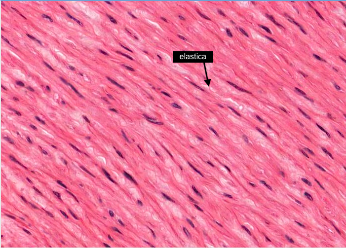 There are many layers of "wiggly" or "contracted" elastic membranes (elastic lamellae) interspersed amongst layers of smooth muscle cells each with an elongated nucleus. The cytoplasm of the smooth muscle cells extends past the ends of their nuclei and stains darkly,