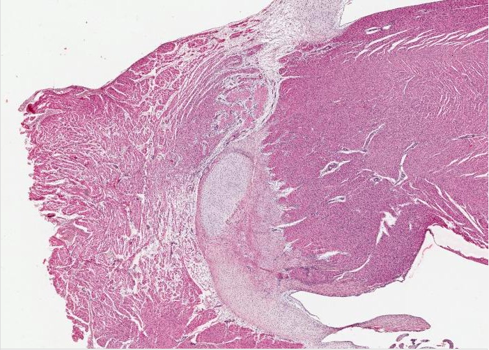 The light stained region on the left side of this image would be part of the septum separating the cardiac muscle mass of the atrium from that of the ventricle.