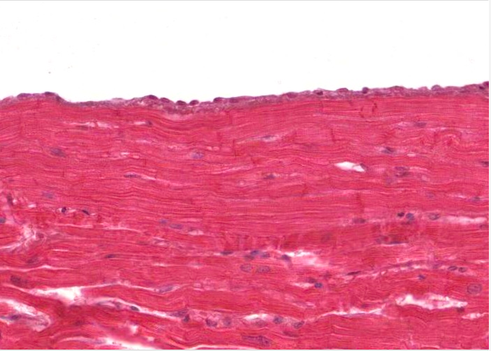 The epicardium is a fairly thick layer of loose connective tissue (mostly adipose tissue) with a single layer of mesothelial cells on the free surface (not visible in this image). Aggregations of fat cells are a dead giveaway for distinguishing the epicardium from the endocardium.