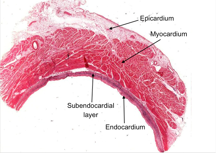 The atrium has the same three layers as the ventricle i.e. epicardium, myocardium and endocardium. However, the myocardium is thinner and the endocardium thicker In the atrium with a well recognised subendocardial layer.