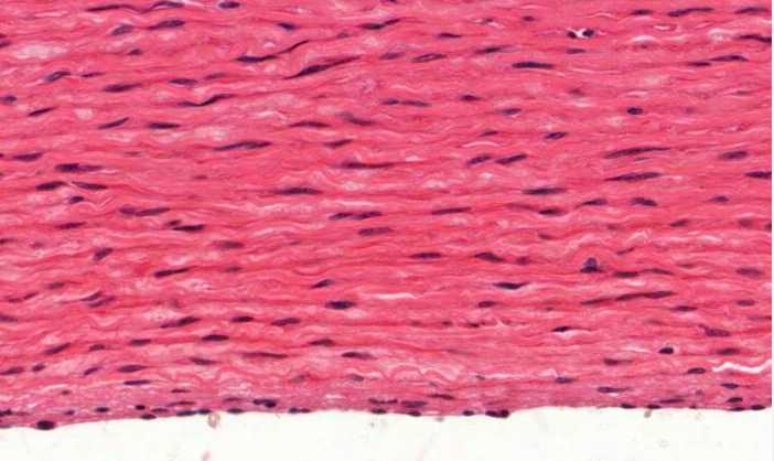 Remember there are no fibroblasts in the tunica media. Collagen fibres are also present but hard to discern from the smooth muscle albeit they are lighter-stained, wavy wisps of tissue in this image. This distinction will become obvious in specially stained sections of the tunica media in items that follow.