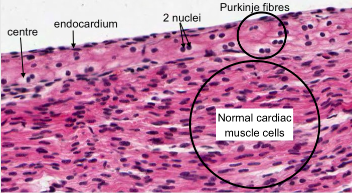 A modified type of cardiac muscle cell, the Purkinje fibre, forms the conduction system of the heart. Bands of these fibres run from the atrium down along the interventricular septum to the apex of the heart to make the ventricles contract from the bottom up. They can best be seen just under the endocardium.