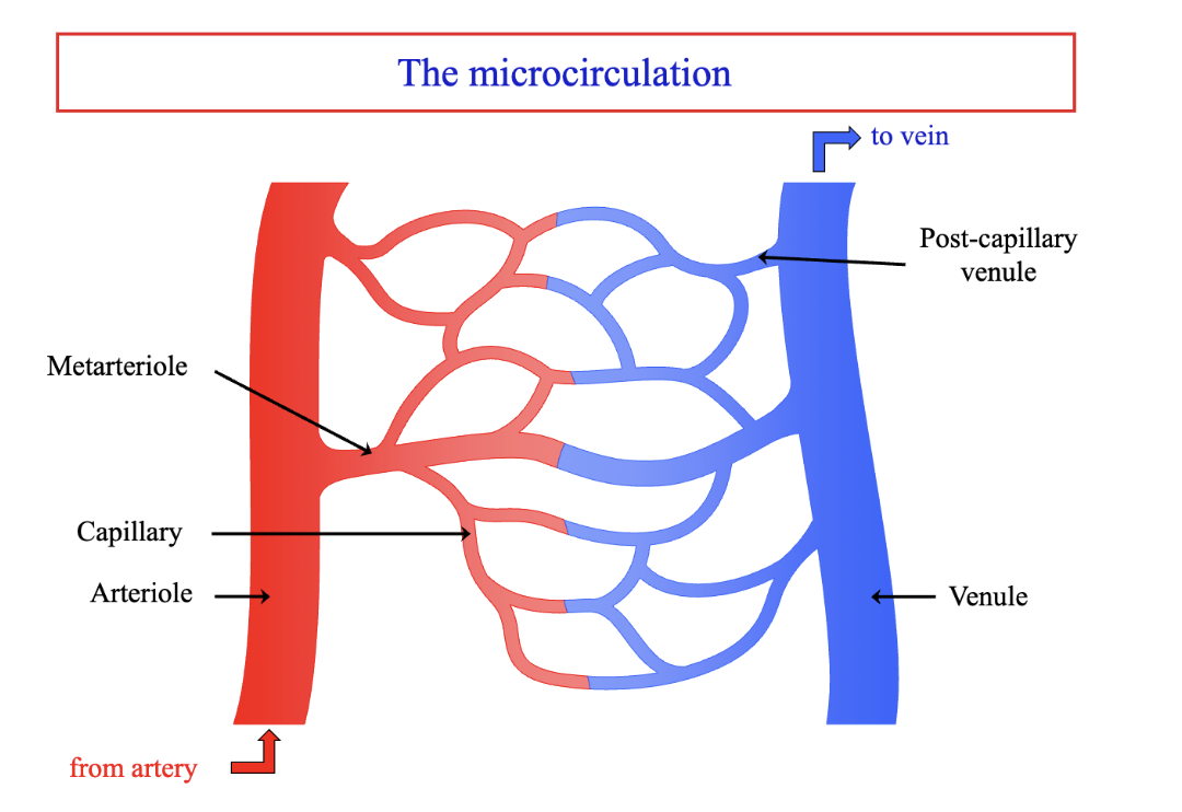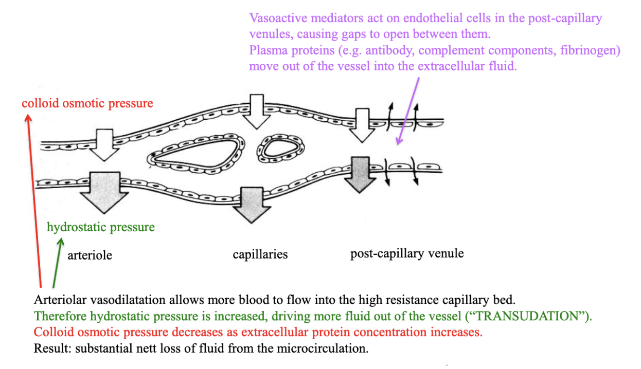 artiole → vasodilation allows more blood flow, hydrostatic pressure increased which drives fluid out of the vessel (transudation). Colloid osmotic pressure decreases as EX protein conc increases. — substaintial net loss of fluid from microcirculation