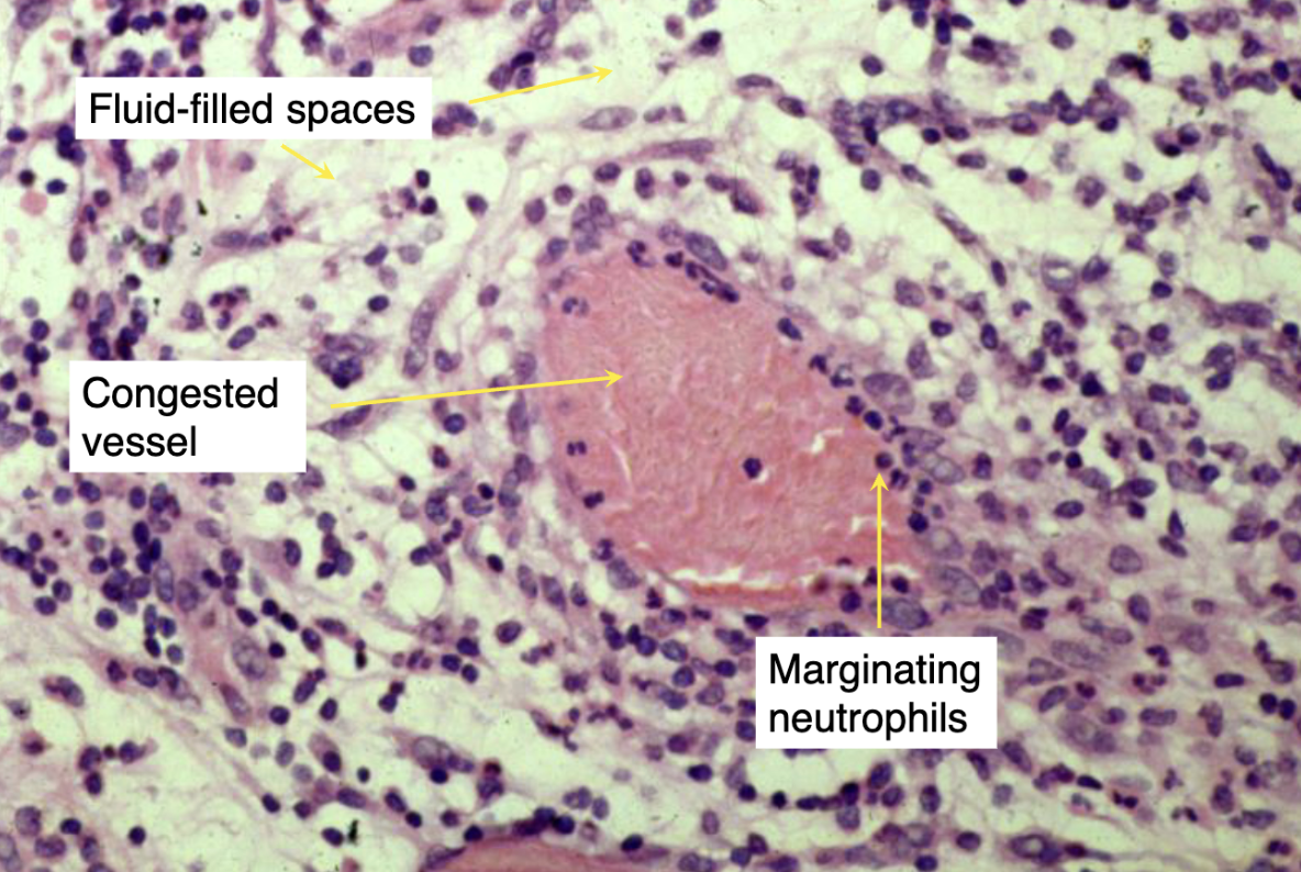 The fluid movement leads to slowing of blood flow in the affected area. The vessels appear “congested.”