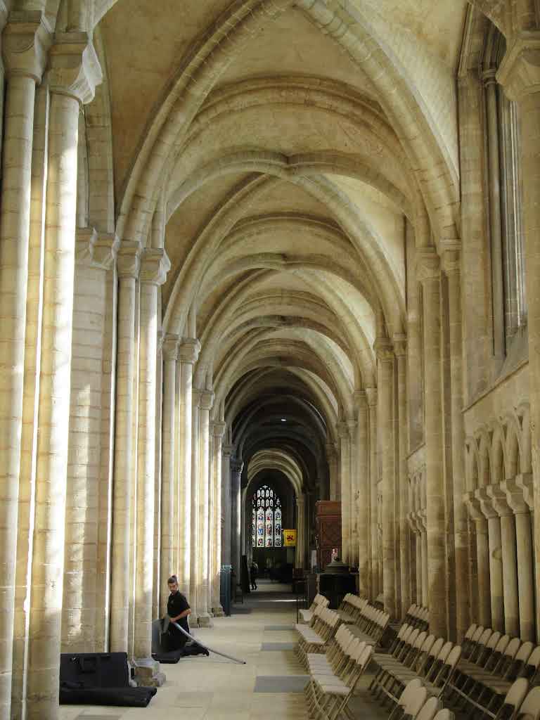 Piers made of multiple bundled shafts that rise into the ribs of the vault, emphasizing verticality.