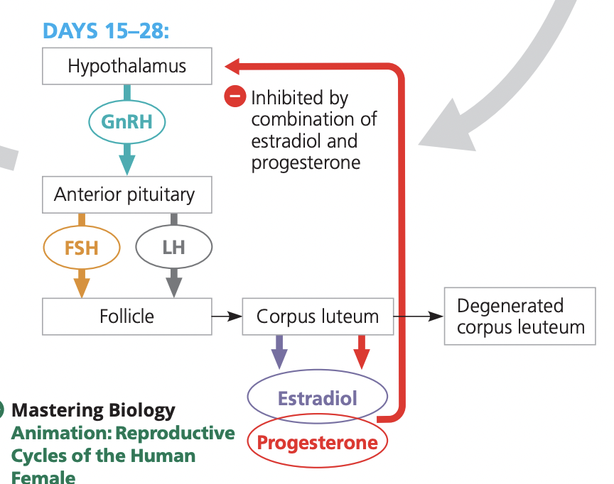 Exerts negative feedback on the hypothalamus and anterior pituitary, suppressing GnRH, LH, and FSH secretion.