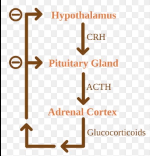 Involves multiple hormone levels in a regulatory chain. The final hormone in the pathway feeds back to inhibit the earlier glands (often the hypothalamus and/or pituitary).