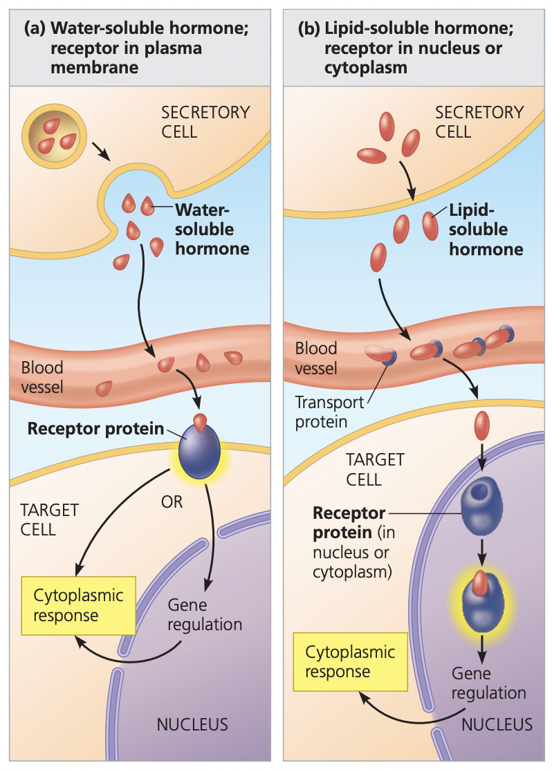 What feature of a hormone determines whether it will initiate a signal transduction pathway or regulate gene expression