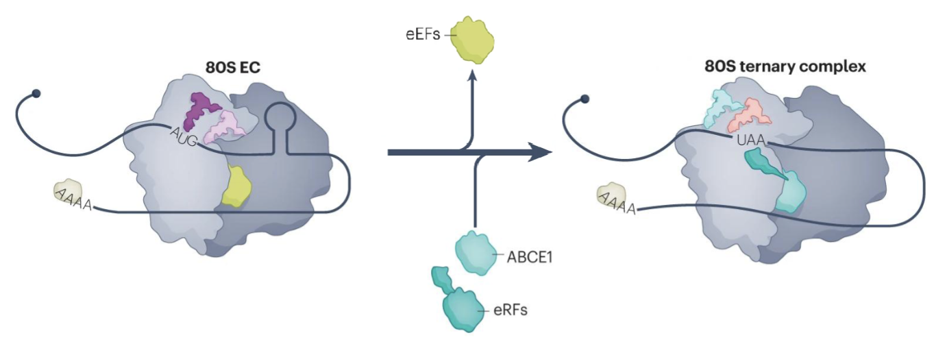 Translation termination by eukaryotic release factors (eRFs) occurs upon encountering a stop codon