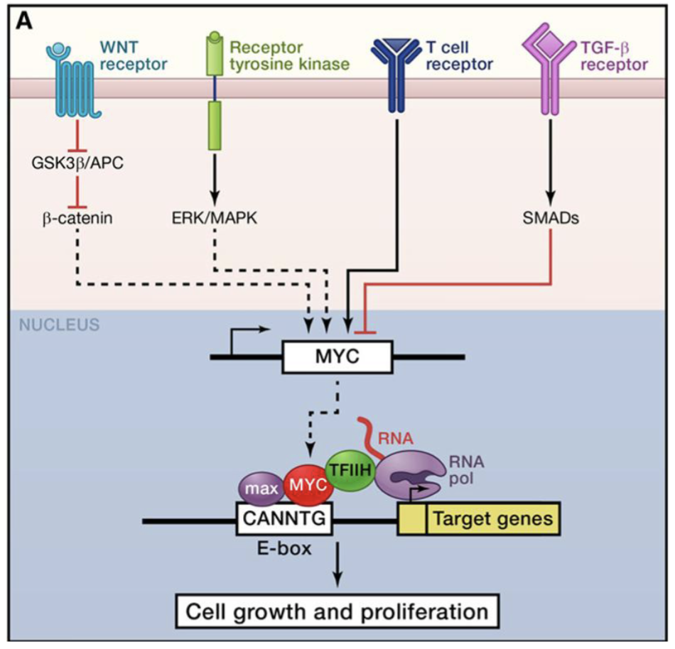 Myc-Max heterodimeric TF complex —> expression of 1,000+ genes which can also affect the cell cycle, favouring proliferation over differentiation