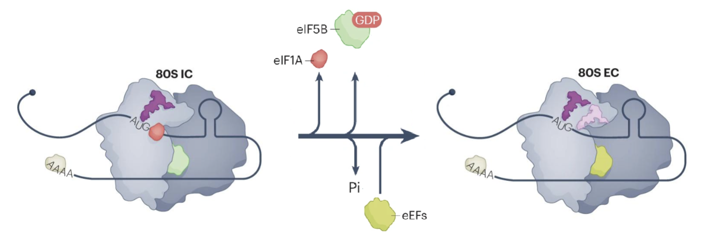 eIF5B release marks the end of initiation and beginning of elongation (80S EC)