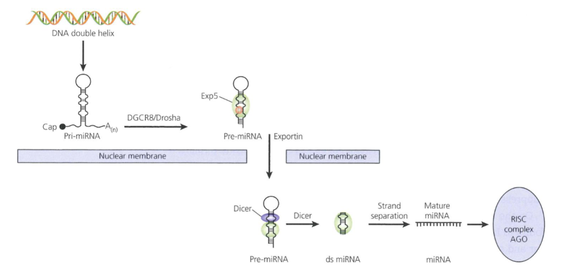 Exportin-5 transports pre-miRNA into cytoplasm to by processed by the ribonuclease Dicer into double stranded miRNA