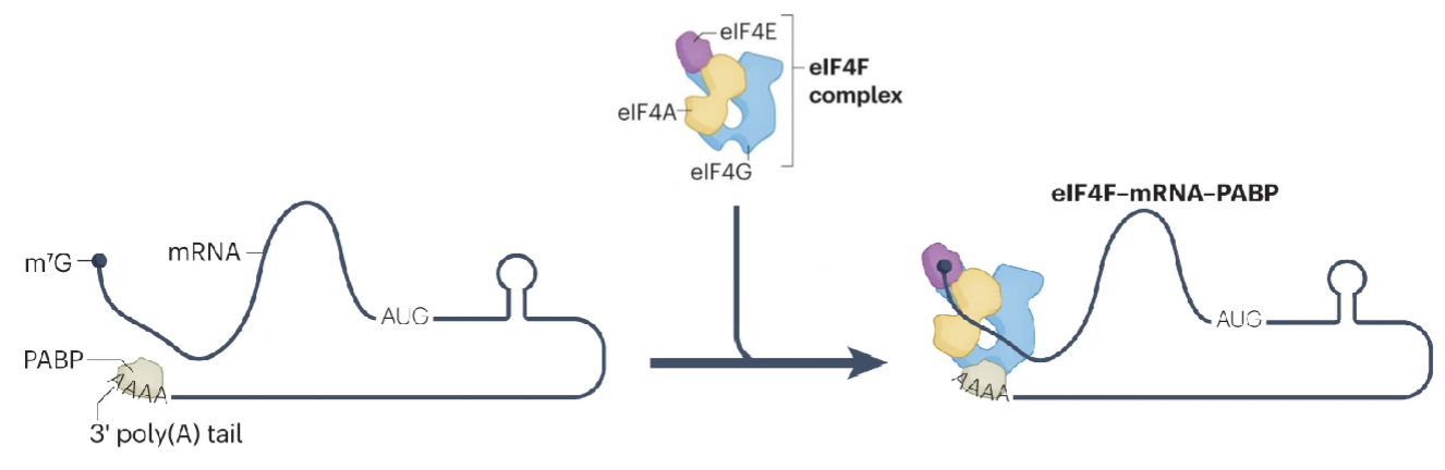 Ribosomes are recruited to the 5’ end of mRNA via the eIF4F complex, consisting of eiF4E, eIF4G, and eIF4A - these are all targets of Myc and can be dysregulated in cancer, amplified in human tumours