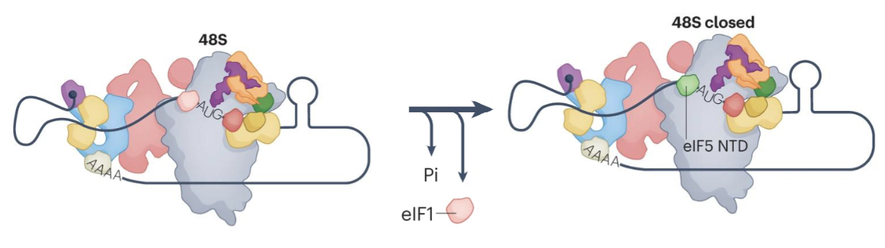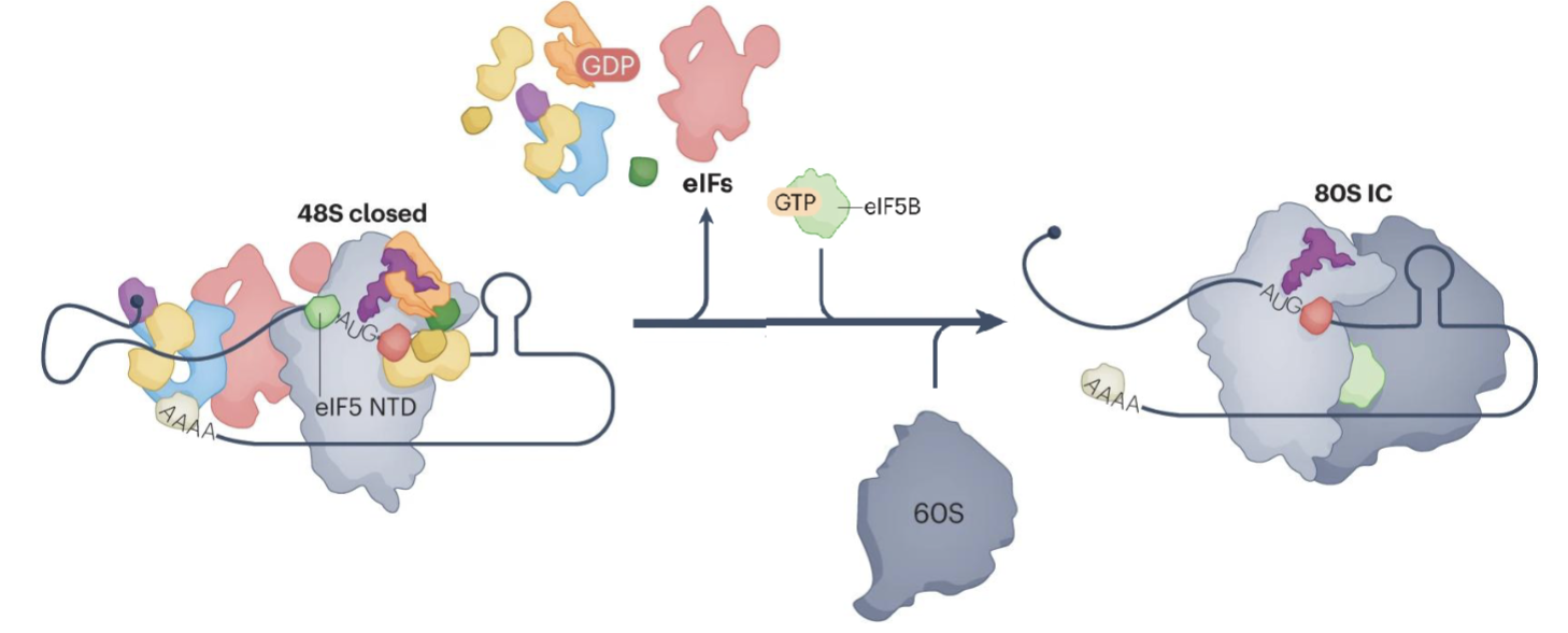 eIF2-GDP release allows eIF5B to bind, promoting the joining of the 60S large subunit, forming the 80S initiation complex (80S IC)