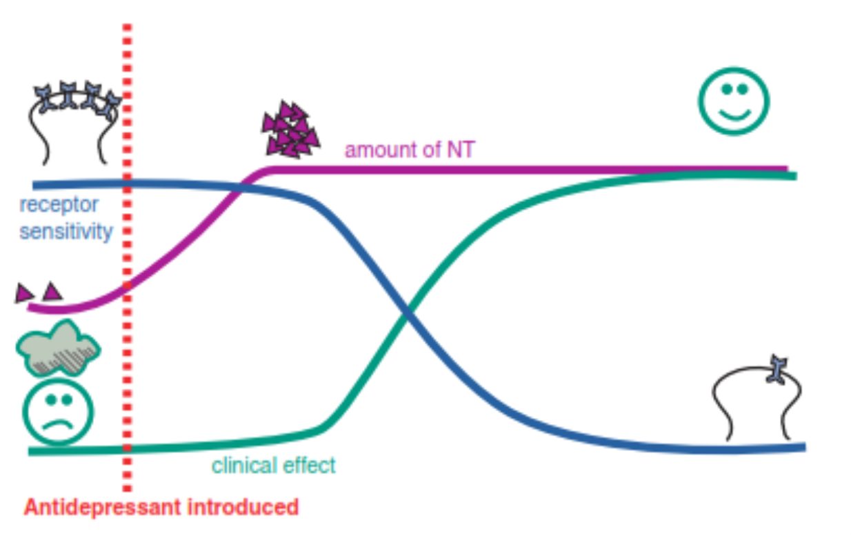 When an antidepressant is introduced, monoamines increase quickly, but theraputic effects in receptor sensitivy take longer