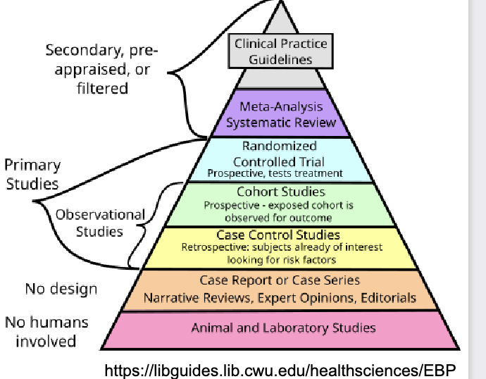 A ranking of study designs by strength of evidence — from animal studies (weakest) to meta-analyses and clinical guidelines (strongest).