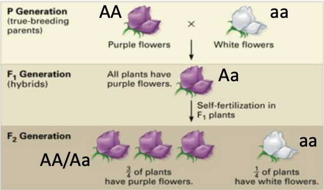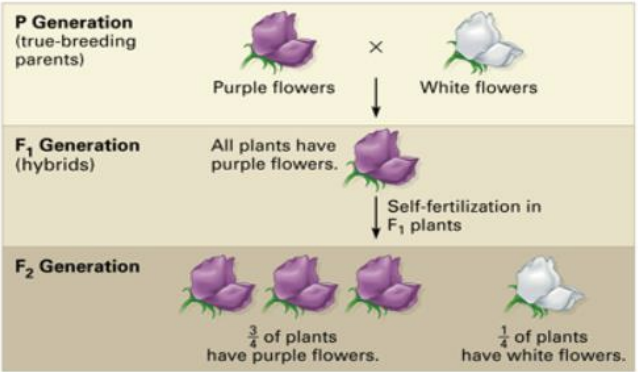 In the F2 generation, there were ¾ purple flowers (75%) and ¼ white flowers (25%)