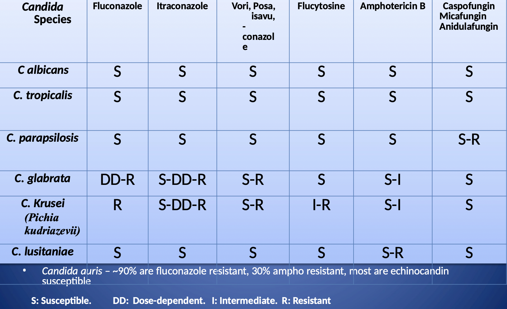 Candida spp with dose-dependent susceptibility or resistance to C. glabrata and C. krusei