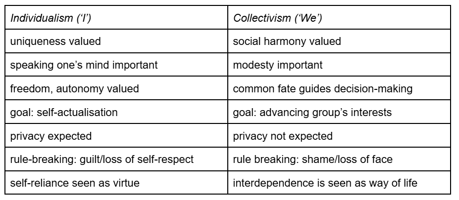 cultural origins of behaviour - cultural dimensions (individualism/collectivism)