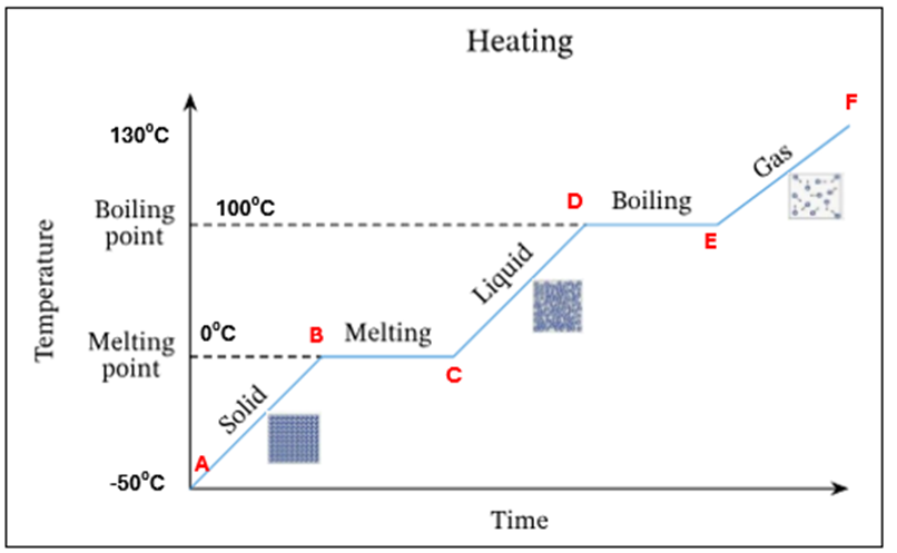 A-B | The temperature of ice is increasing (increase in K.E) – still solid |